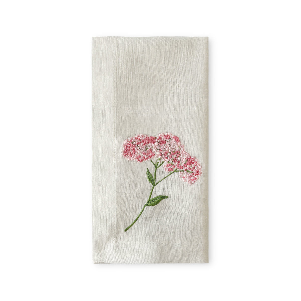 Servilleta en Lino Blanco con Bordado de Flor Rosa, Set de 4