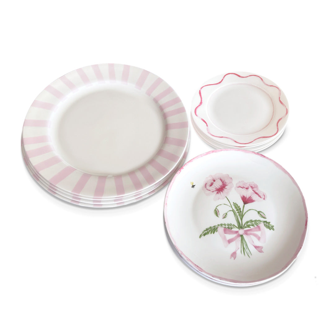 Vajilla con Platos Trinche Candy Cane Rosa Claro, Plato Ensalada con Lisianthus Rosas y Plato para Pan con Ondas en Rosa. Set de 4