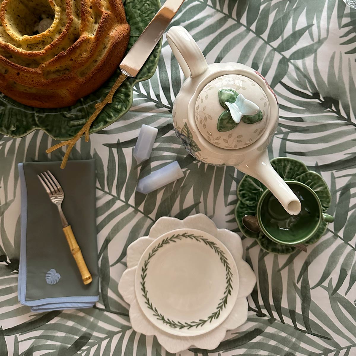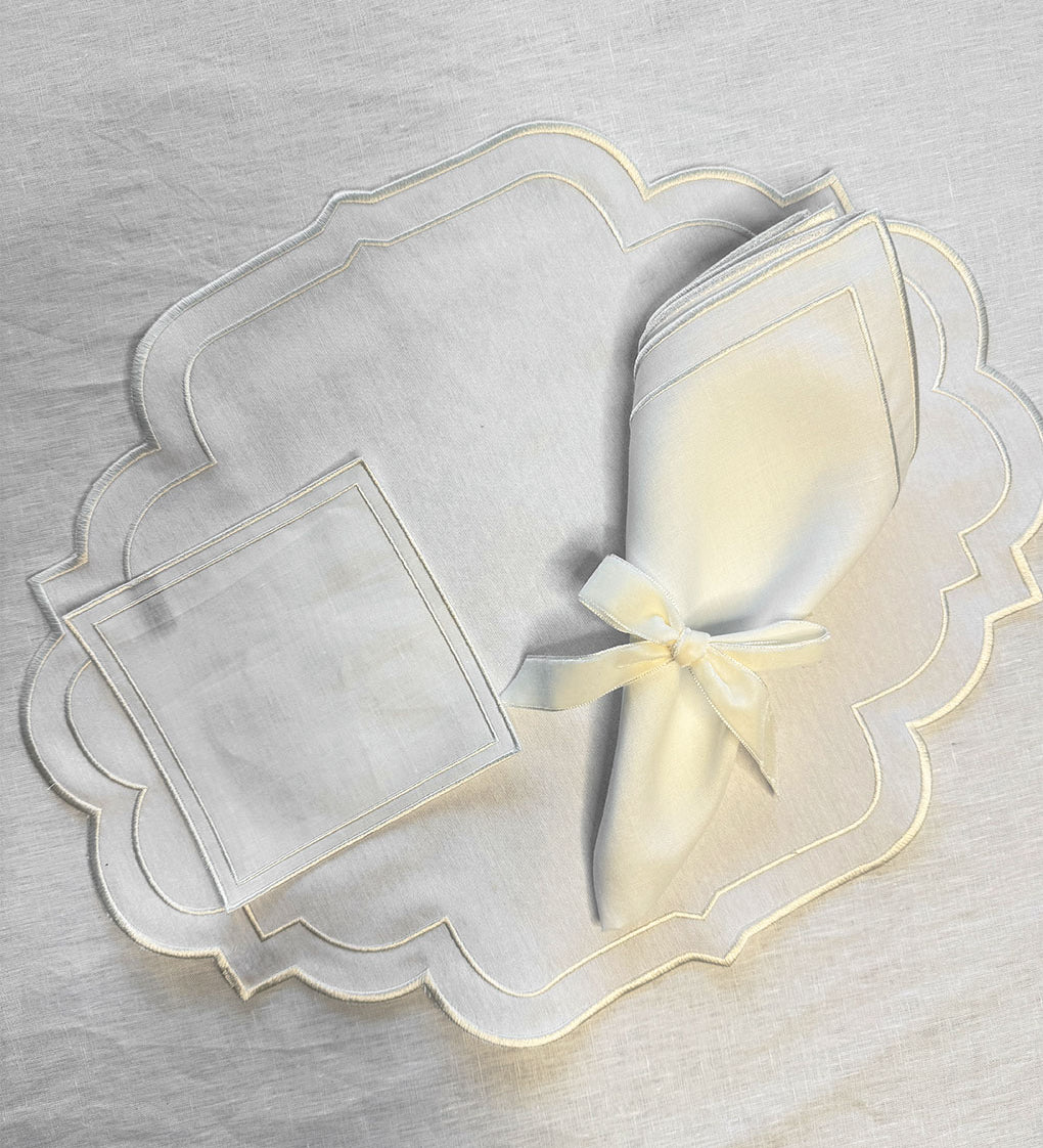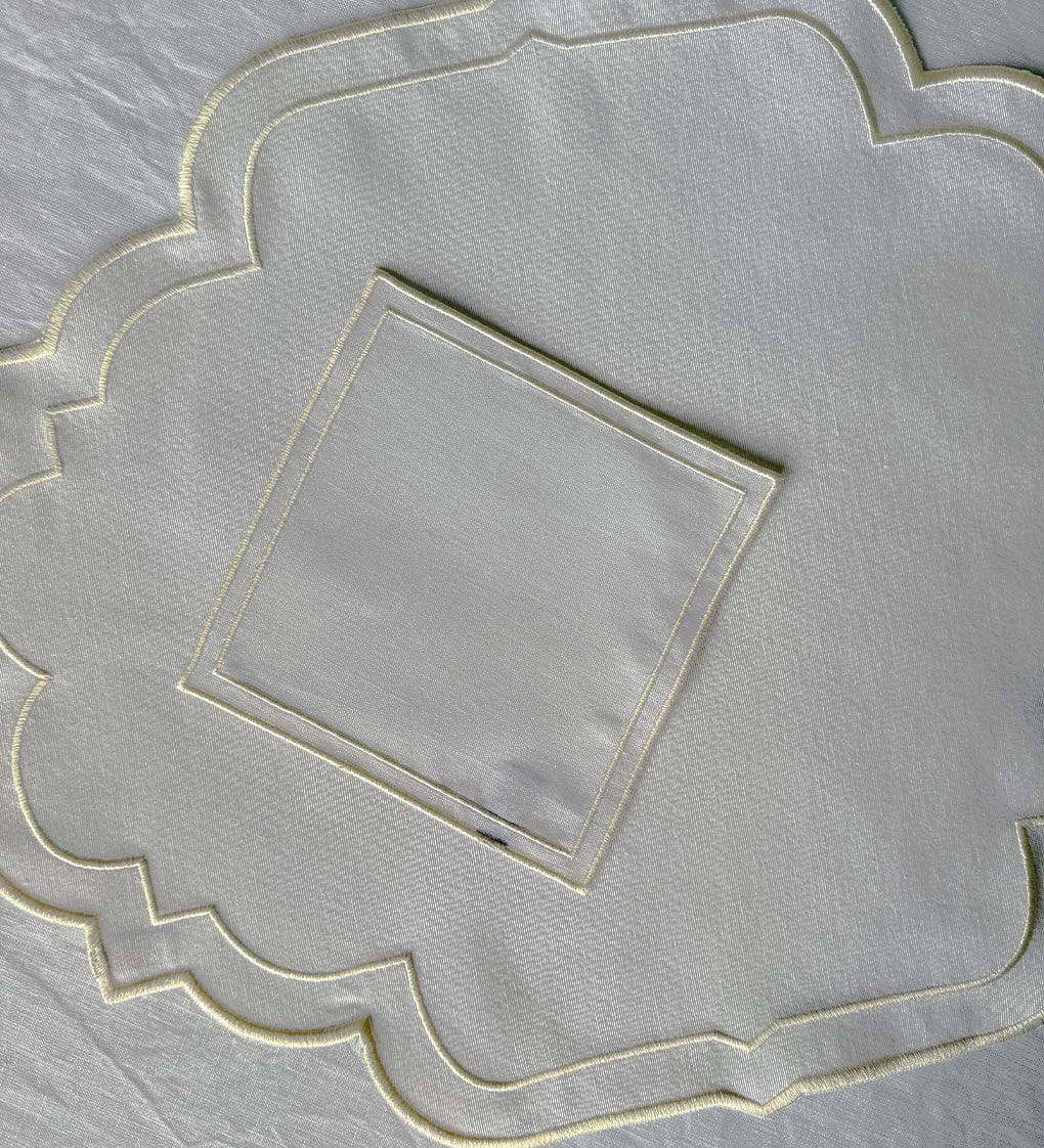Set de Manteleria con Individuales Hannah en Algodon Blanco con Bordado en Ivory y Servilletas Jimmy en Lino Bordado Ivory Set 8 pzas