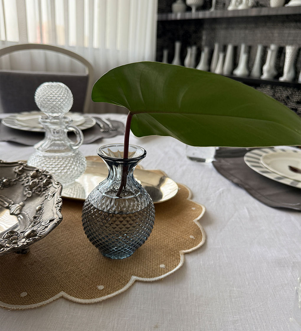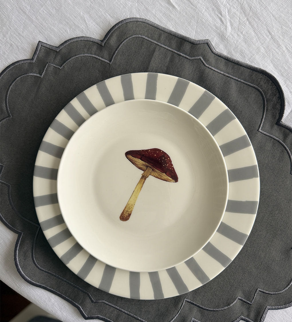 Set de Manteleria con Individuales Hannah en Algodon Gris Oxford con Bordado Gris y Servilletas Jimmy en Lino Bordado en Gris Oxford