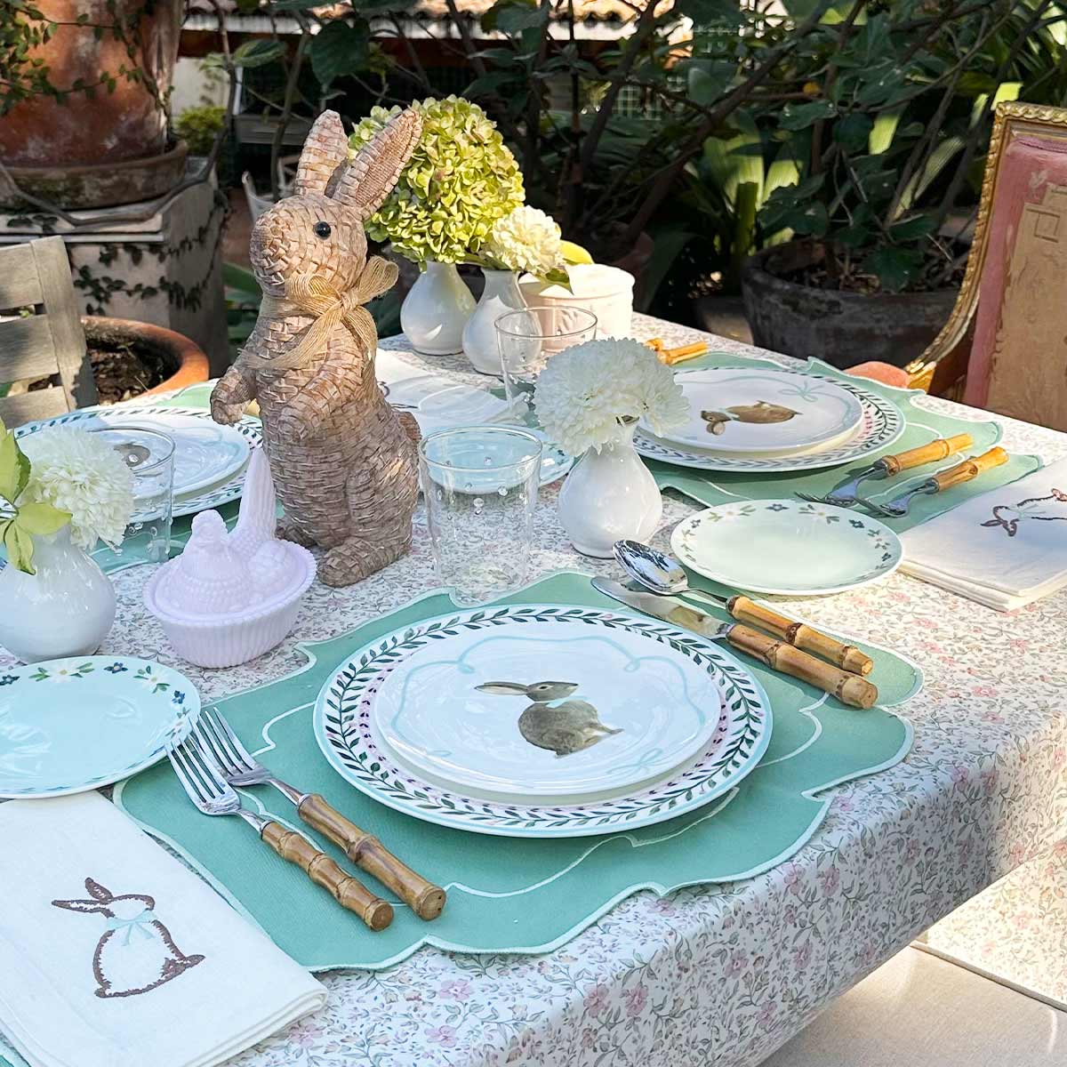 Set de Vajilla Spring Bunny con 4 Platos Trinche con Borde de Flores, 4 Platos para Ensalada con Conejo y 4 platos para Pan con Guirnalda de Flores.