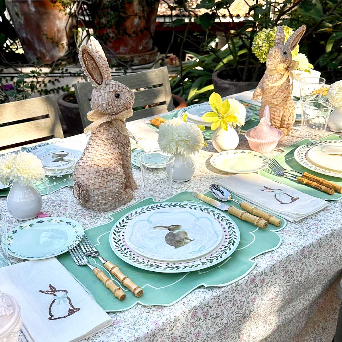 Juego de 4 Servilletas de Lino con Bordado de Conejo con Moño Verde
