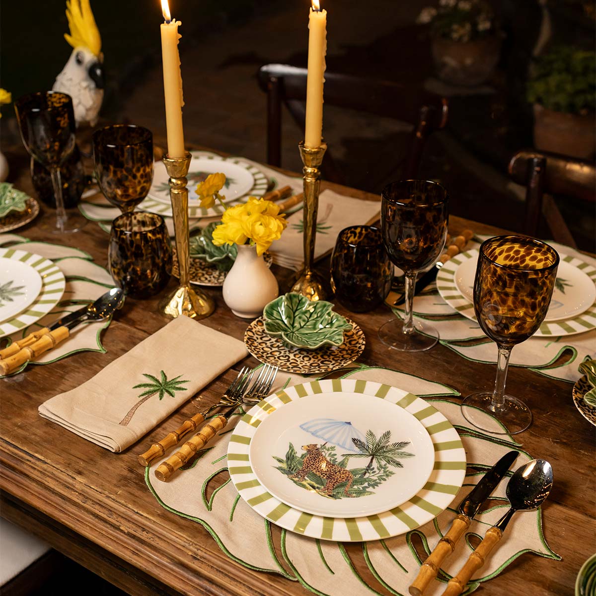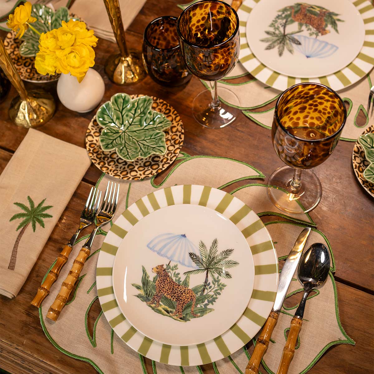 SAND TROPIC COMPLETE ZASHPACK: Individuales y Servilletas Tropic en Lino Arena con Bordado Verde con Plato Trinche Candy Cane Verde y Plato Ensalada de Leopardo con Sombrilla