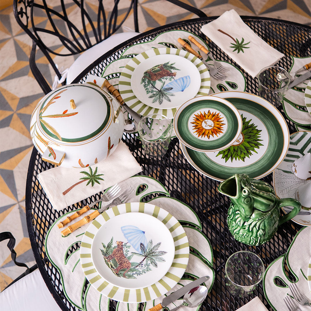 PALMTREE ZASHPACK: Set con 4 Servilletas Tropic en Lino Arena con Bordado de Palmera y 4 Platos de Ensalada con Leopardo y Paraguas.