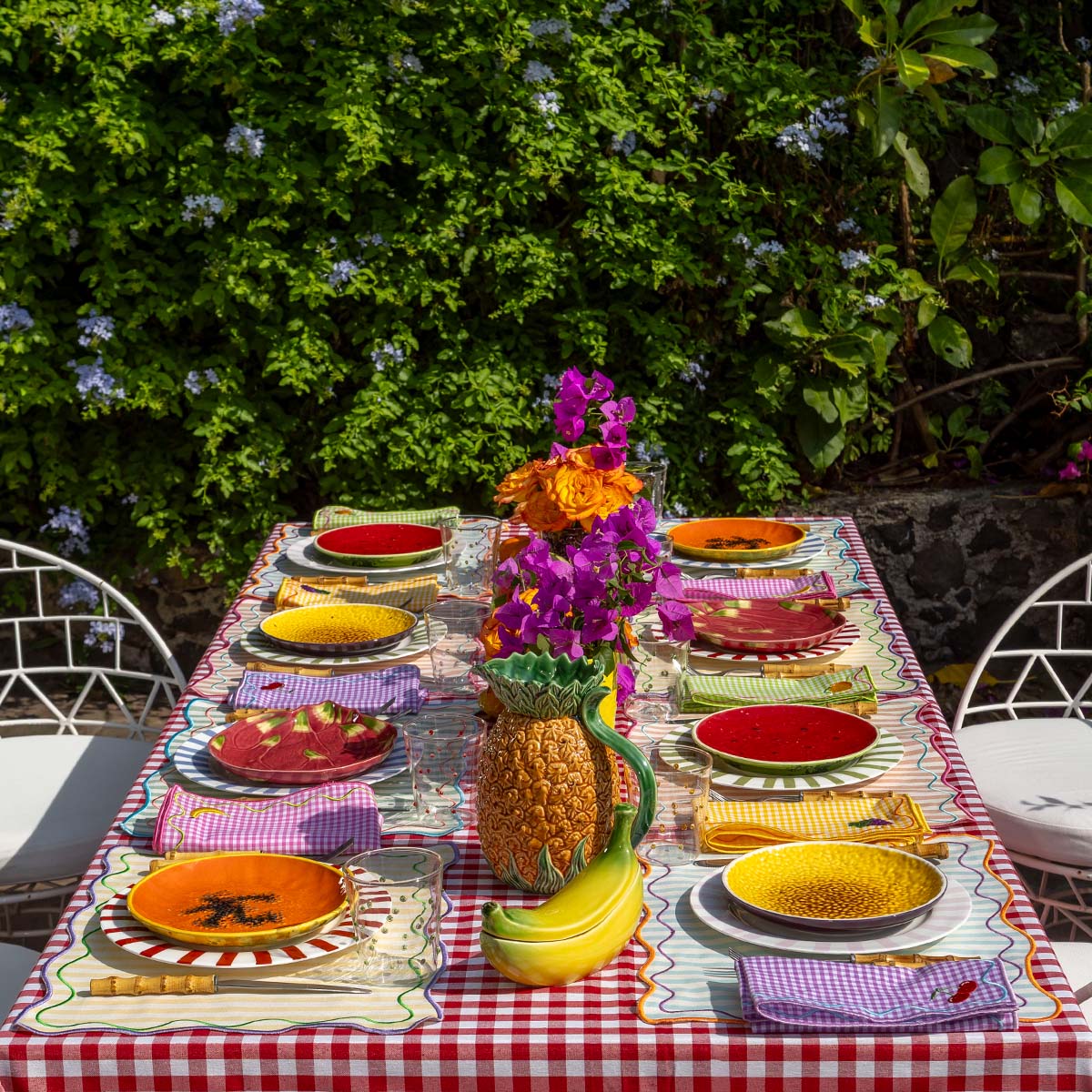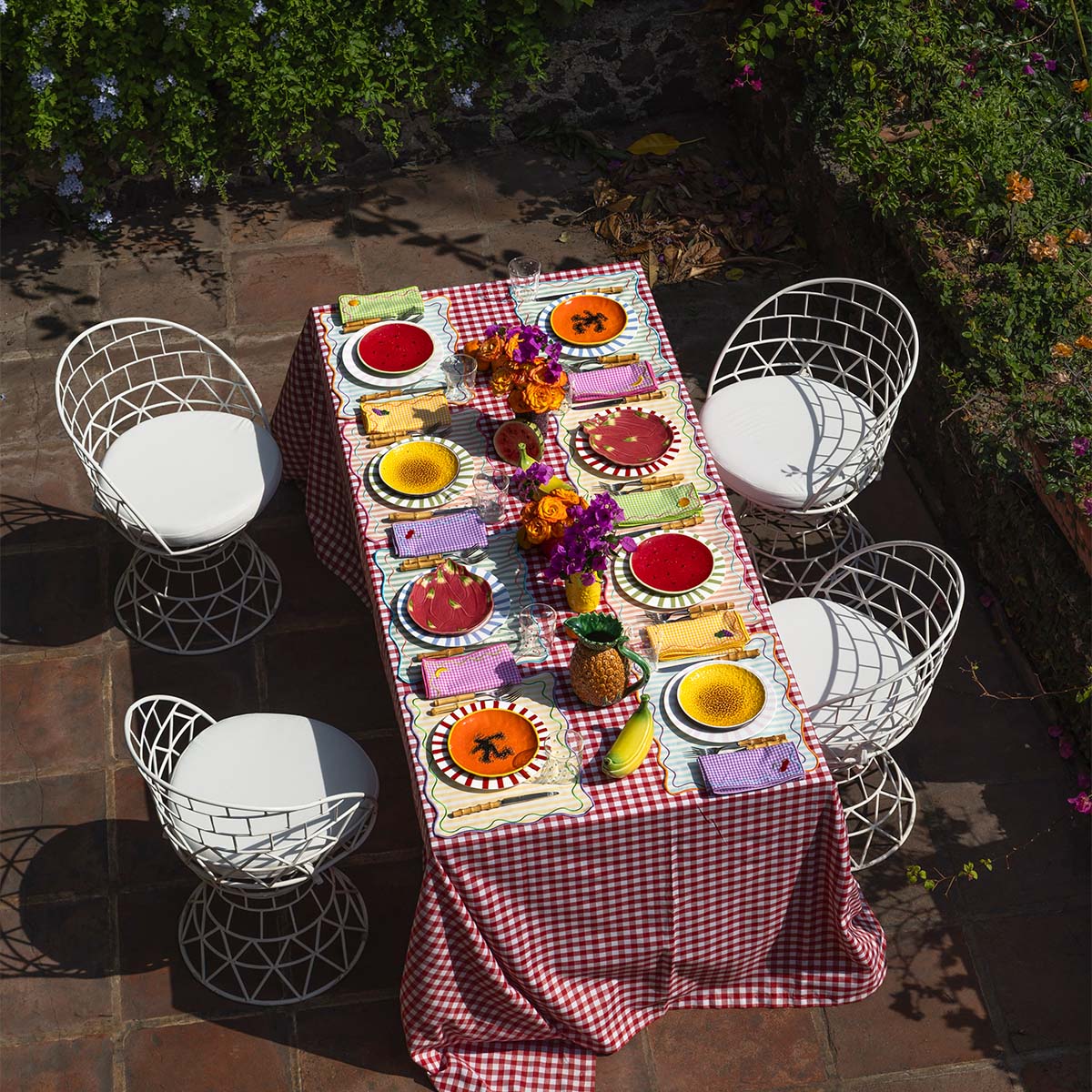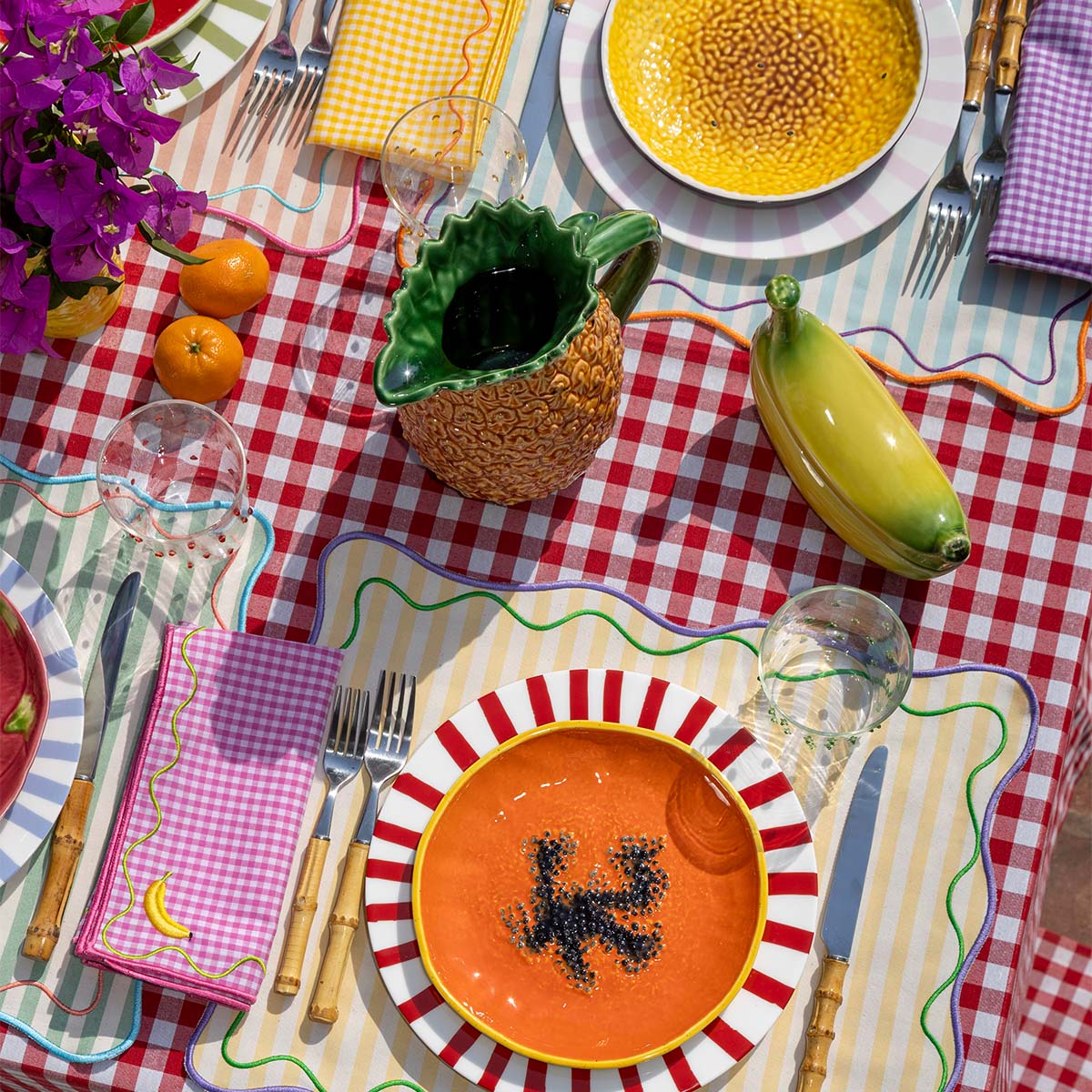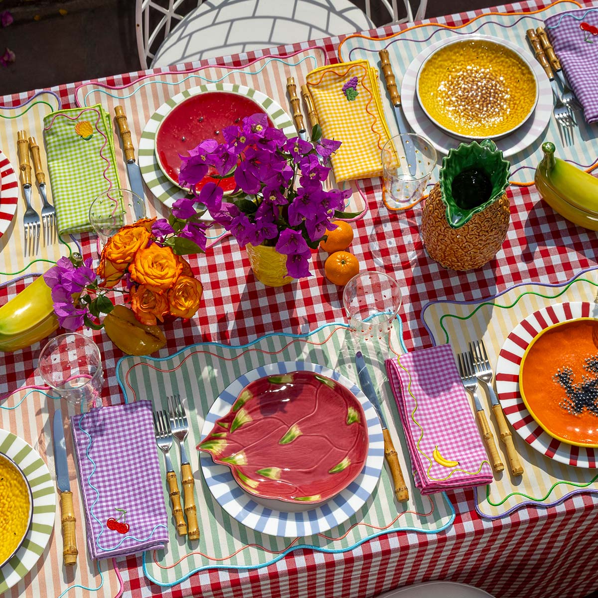 Individuales Tutti Frutti en Algodón Rayas de Colores con bordado de Ondas. Set de 4