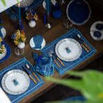 Cocteleras de Bota en Lino Azul con Bordado Turquesa. Set de 4