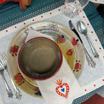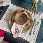 Mantelería Milagritos con Individuales Silvia con Puntitos Rojos y Servilletas Milagritos con Bordado de Corazón en llamas en Lino Arena. Set para 4 personas.