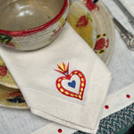 4 Servilletas Milagritos con Bordado de Corazon en llamas en Lino Arena.