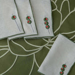Mantelería Olivos con Individuales Blossom Bordado en Algodón Verde Olivo y Servilletas con Bordado de Aceitunas en Lino Arena. Set para 4 personas