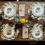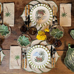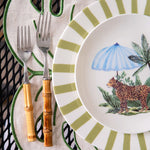Vajilla para 4 personas con 4 platos trinche de franjas verdes y 4 platos de ensalada con una encantadora imagen de cheetah bajo una elegante sombrilla. Ideales para estos días de calor.