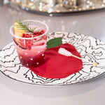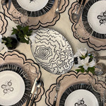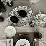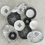 En set de platones para servir con dibujos de los mapas topográficos de los volcanes emblemáticos de México: El Iztaccíhuatl, El Paricutín y El Pico de Orizaba.