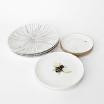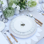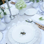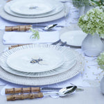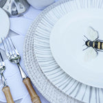 Set de Vajilla Spring Bee para 4 personas con Platos Trinche Rayas Gris Plata, Platos Ensalada Abeja y Plato para Pan con Abeja Volando.