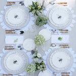 Set de vajilla Spring Bee con 4 platos trinche de Rayas Gris, 4 platos de ensalada de Abeja, 4 platos de pan de abejita. 12 piezas en total. Un setting fresco, alegre y muy chulo.
