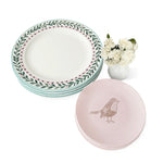 Vajilla para 4 personas de Porcelana con guirnalda de flores y Platos de Ensalada blancos con Pájaro. Los platos perfectos para mesas de Pascua y primavera.