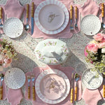 Vajilla para 4 personas de Porcelana con Platos Trinche con Rayas Rosas y Platos de Ensalada blancos con Pájaro y. Los platos perfectos para mesas de Pascua y primavera.