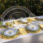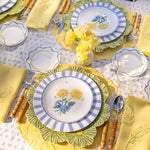 Vajilla con Platos Trinche Candy Cane Azul, Plato para Ensalada con Dalias amarillas y Plato para Pan con Ondas en Azul y Anillo Amarillo. Set de 4