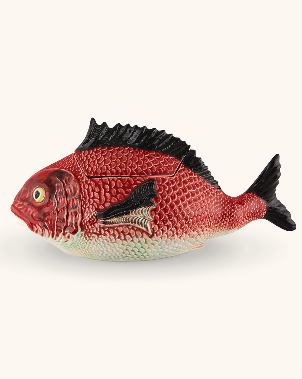 Impresionante sopera de cerámica de gran tamaño en forma de pez huachinango de Bordallo Pinheiro. Sirve sopa o ceviche de la manera más chic.