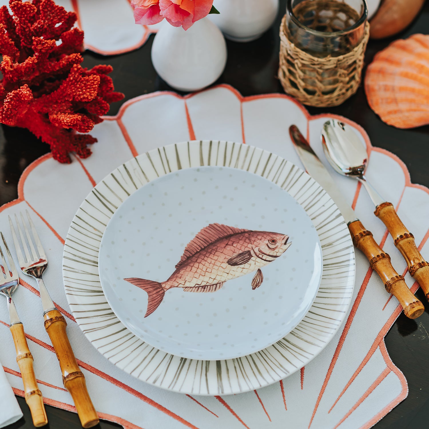 HIGH TIDE ZASHPACK: Set de 4 Platos de Ensalada con Pez con Set de 3 Floreros de Cerámica en Forma de Conchas.