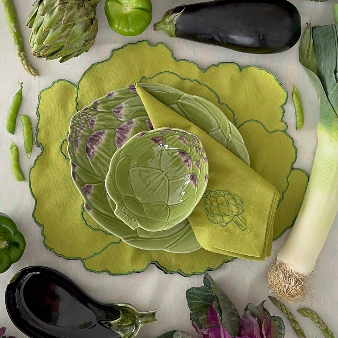 THE GREEN ARTICHOKE ZASHPACK: Set con 4 Servilletas Veggies en Algodón Verde Bordado con Verduras y 4 Platos para Ensalada en Forma de Alcachofa Verde de Bodallo Pinheiro.