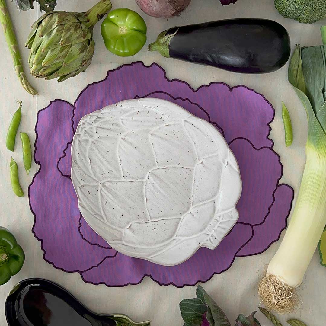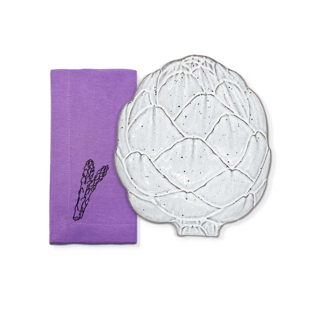 THE WHITE ARTICHOKE ZASHPACK: Set con 4 Servilletas Veggies en Algodón Morado Bordadas con Verduras y 4 Platos para Ensalada en Forma de Alcachofa Blanca de Bodallo Pinheiro.