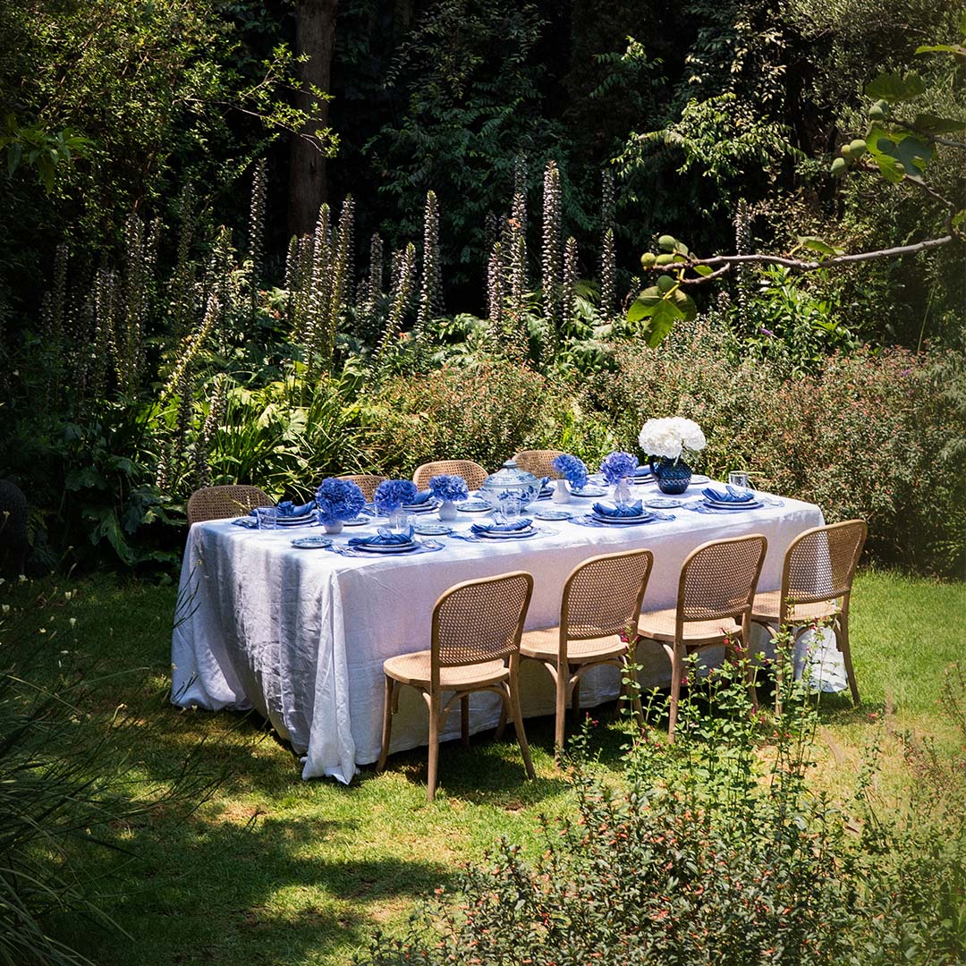 The Royal Blue Flower Zashpack: Set con 4 Platos para Ensalada con Hortensia, Mantelería Sofía completa con 4 Individuales, 4 Servilletas y 4 Servilleteros Tulipán en Lino Azul y Bordado en Azul.