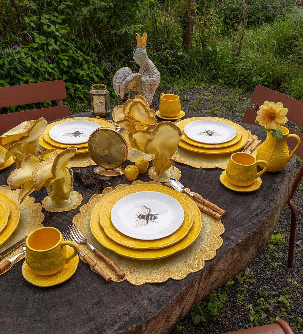 THE YELLOW MEADOW ZASHPACK: 4 Coasters Vivi en Lino Amarillo con Bordado de Pelitos y 6 Vasos Pippa con Puntitos Amarillos