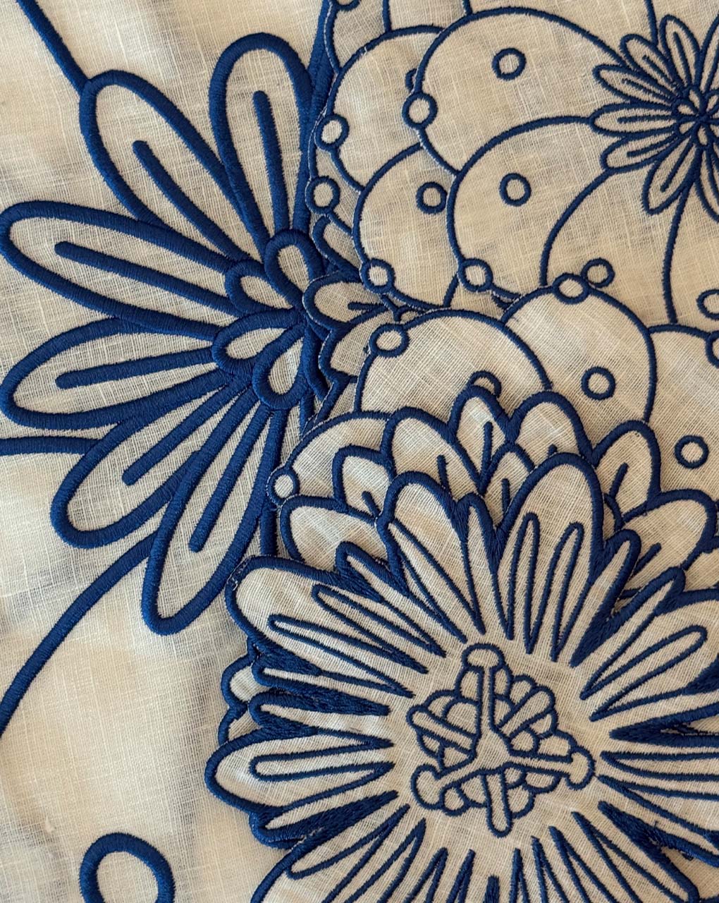 La mantelería IDENTIDAD de Sofía Aspe Interiorismo la esencia de México en cada mesa. Los coasters son confeccionados en lino español bordado en forma de biznaga, paciflora y dalia con hilo azul. Sofisticados y clásicos.