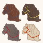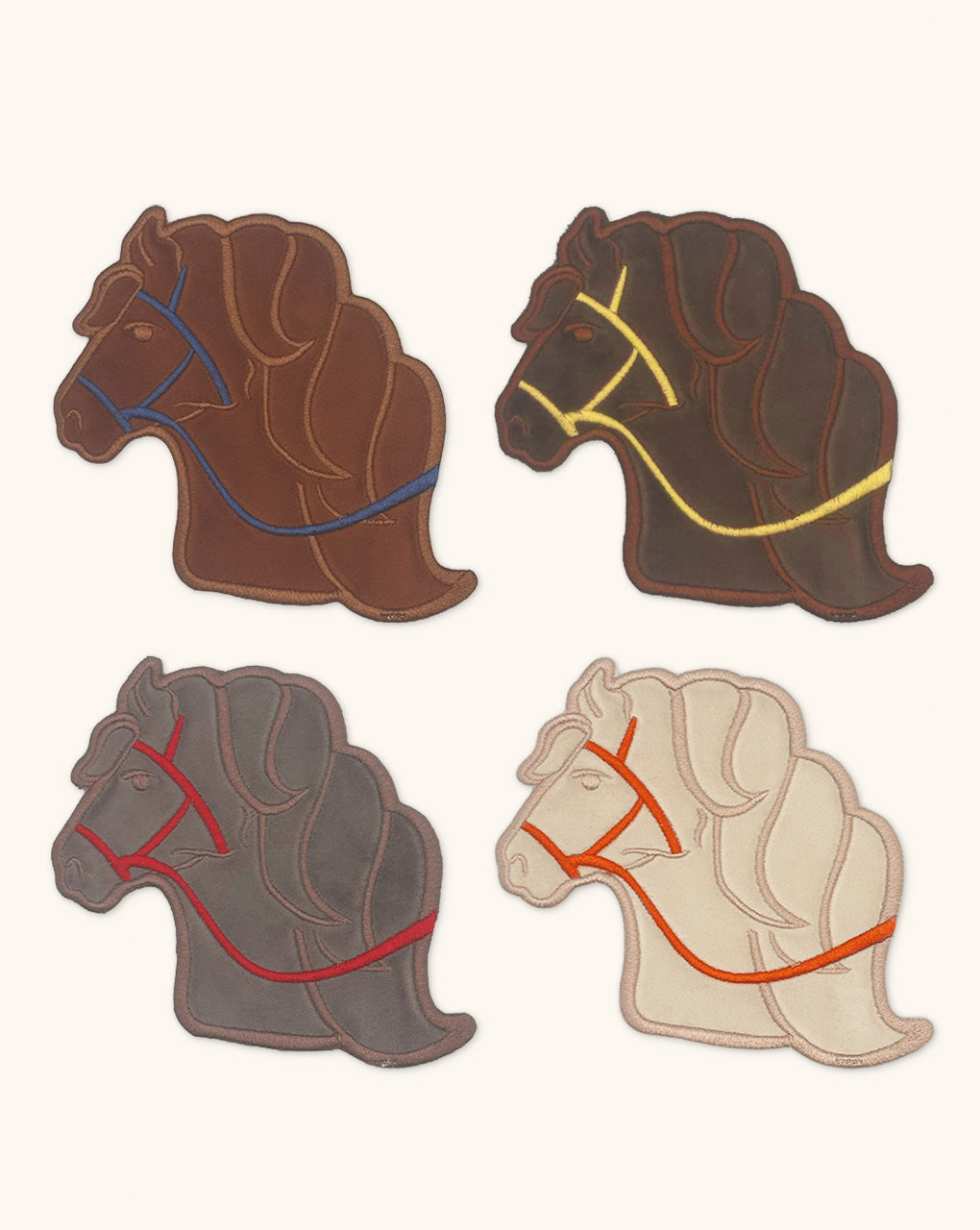 Cocteleras en forma de caballo bordadas en terciopelo con cuatro colores diferentes: ivory, ladrillo, café y topo.