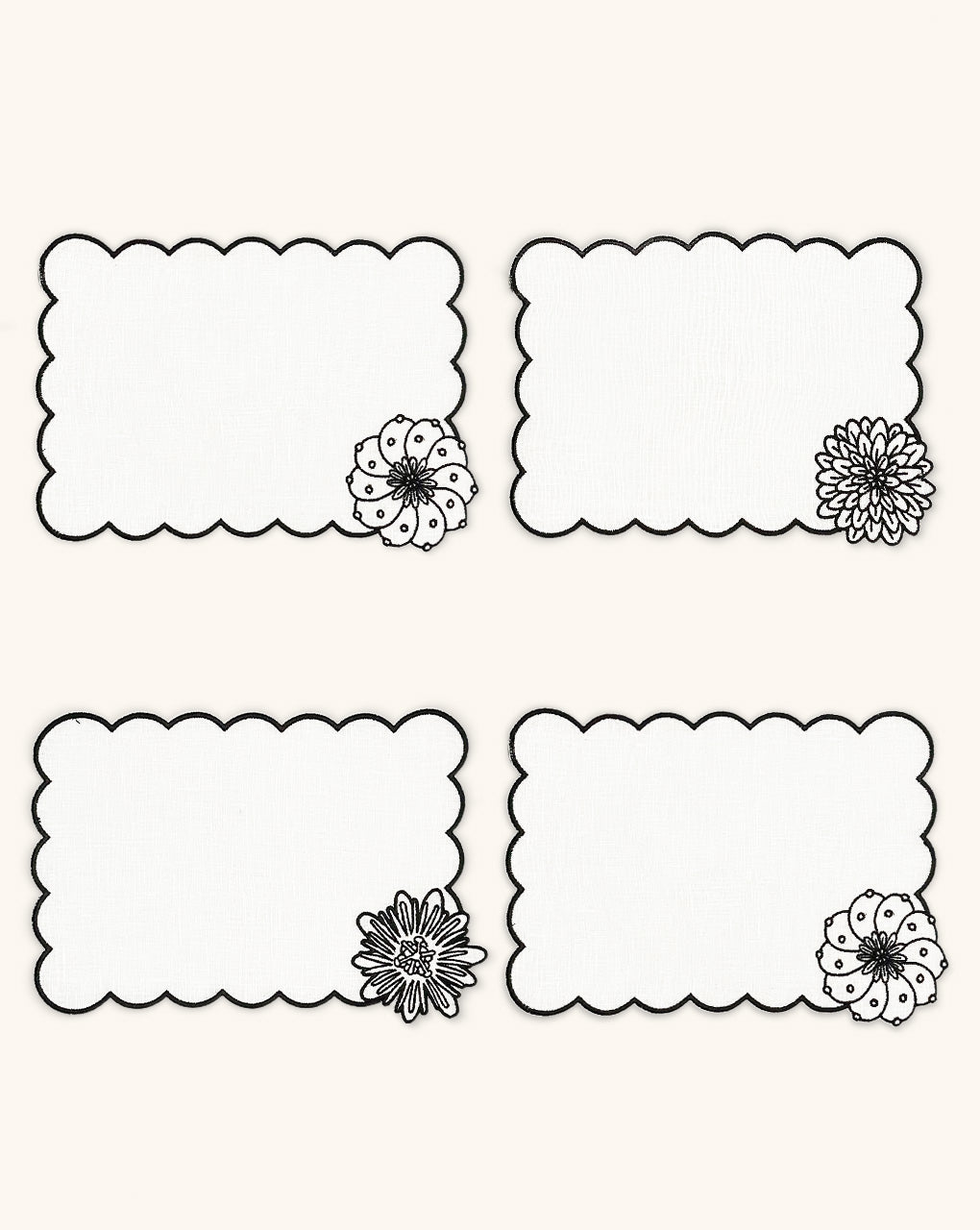 Cocteleras Identidad en Lino Blanco con bordado de Biznaga, Pasiflora y Dalia Negras. Set de 4