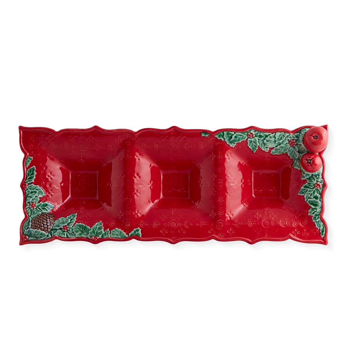 Espectacular fuente con 3 divisiones con decorados de piñas de pino y misteltoe de Bordallo Pinheiro. Ideal para botanas, aperitivos, galletas y todo para ofrecer a tus invitados en las fiestas.