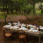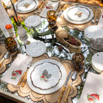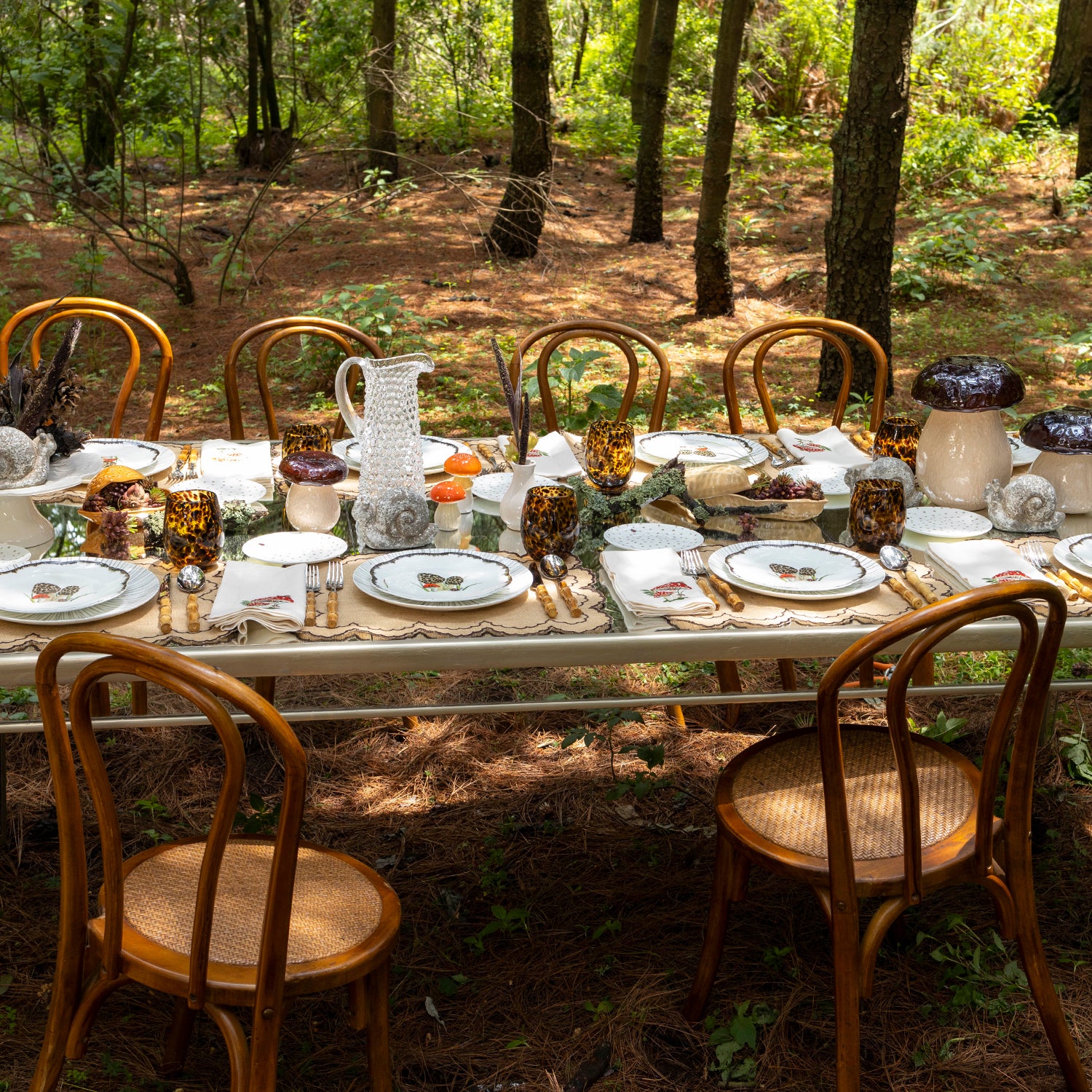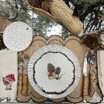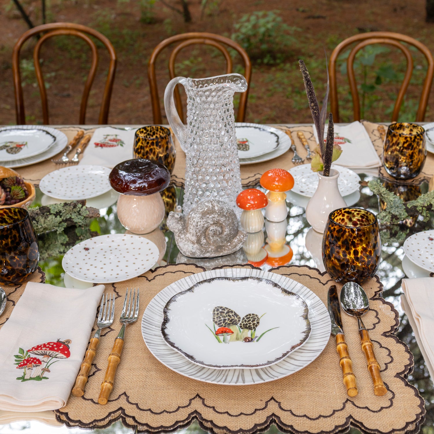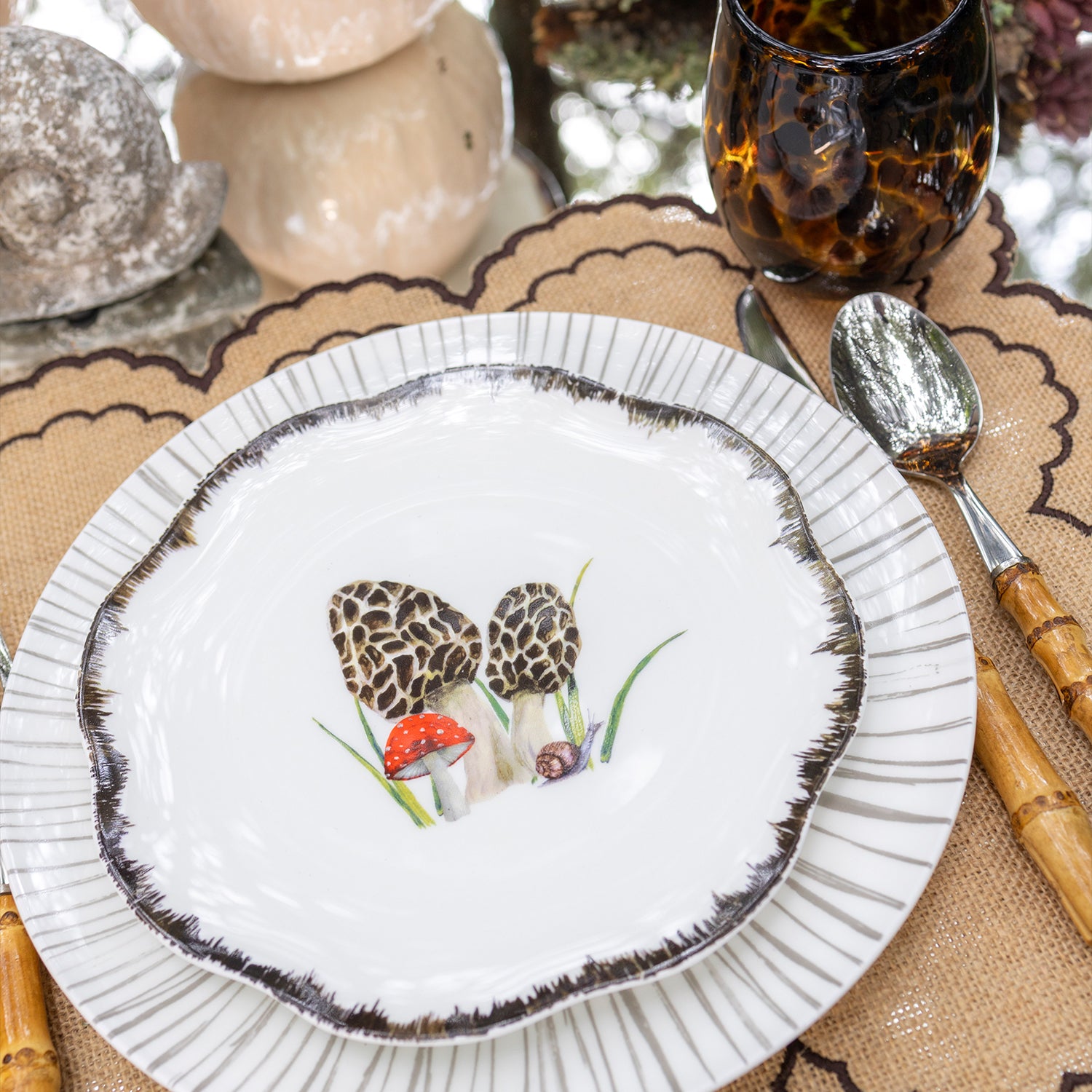 HONGO HARVEST ZASHPACK: Plato para Ensalada con Morilla y Borde de Ondas y Servilleta en Lino Color Crudo con Bordado de Hongos. Set para 4 personas