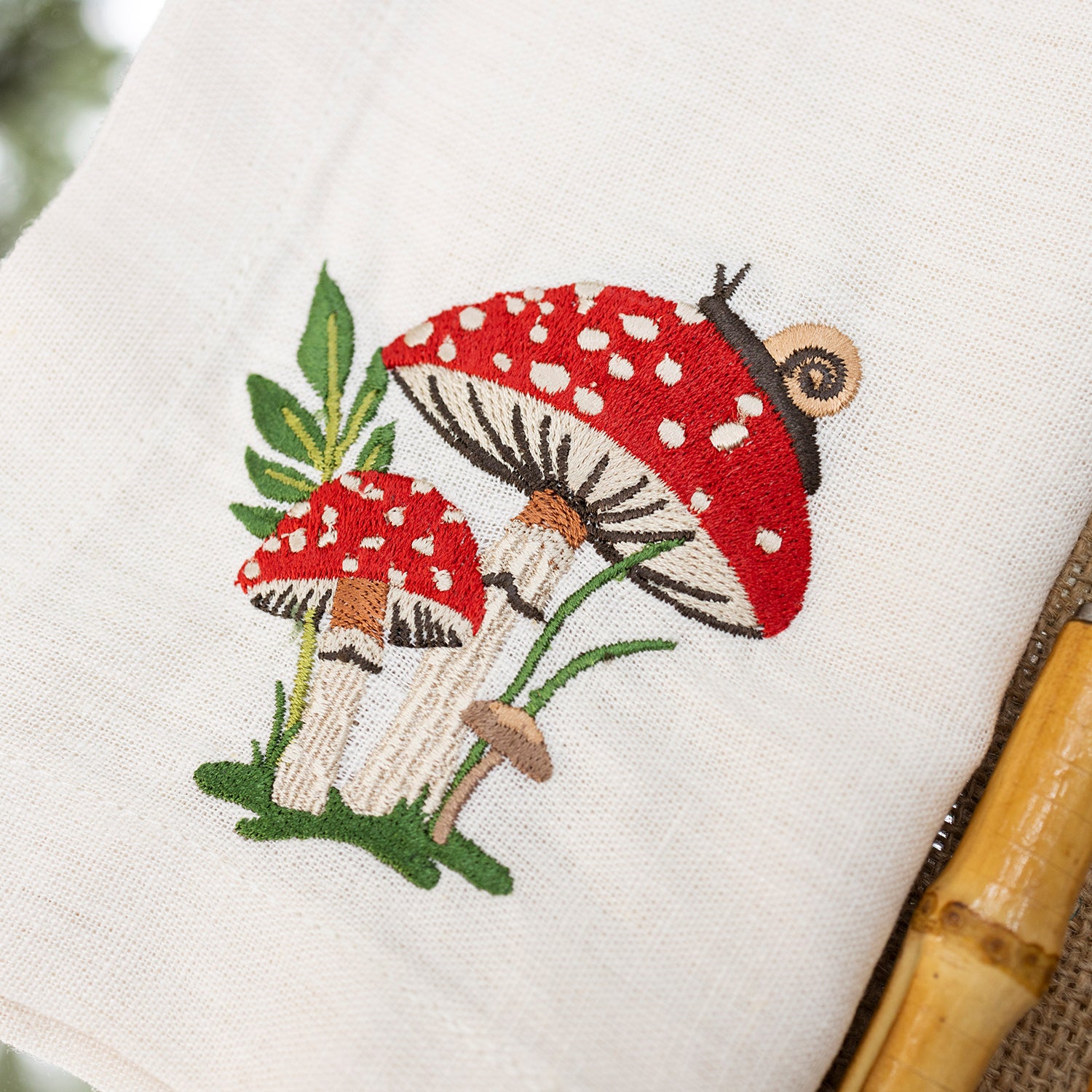 - 4 Servilletas en Lino Color Crudo con Bordado Motivo de Hongo y Caracol