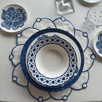 La mantelería IDENTIDAD de Sofía Aspe Interiorismo la esencia de México en cada mesa. Los individuales son confeccionados en lino español bordado en forma de biznaga con hilo negro. Sofisticados y clásicos.