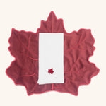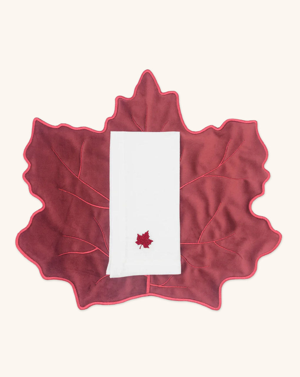 Juego de 4 Individuales Maple en Terciopelo Chedrón con Orilla Bordada con 4 Servilletas en Lino Blanco con Hoja de Maple bordada en Chedrón