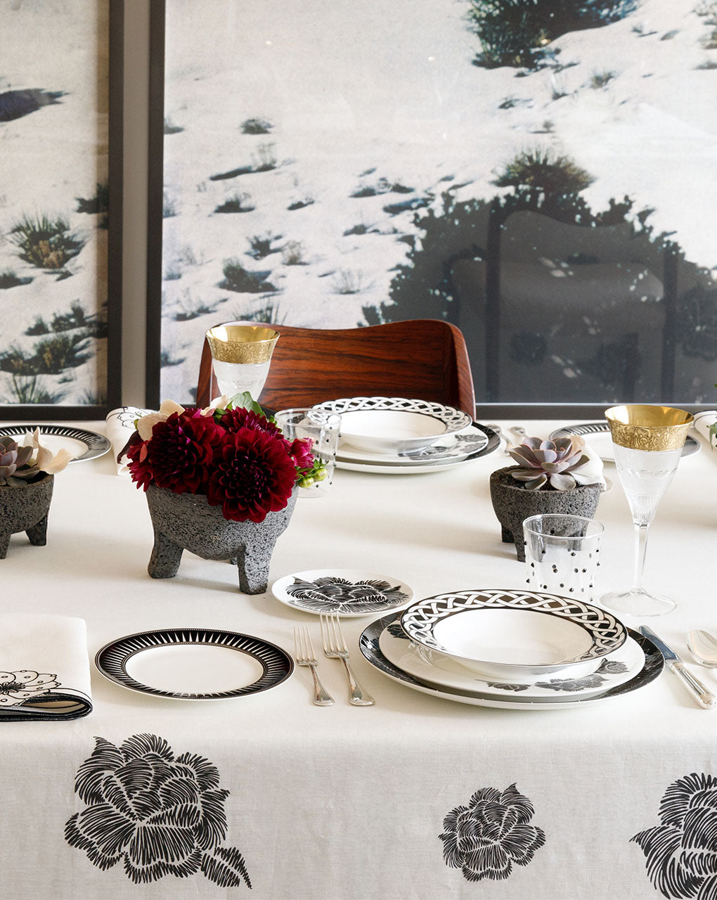 La mantelería IDENTIDAD de Sofía Aspe Interiorismo la esencia de México en cada mesa. El mantel esta confeccionado en lino español con estampado de flores en negro. Sofisticado y clásico.