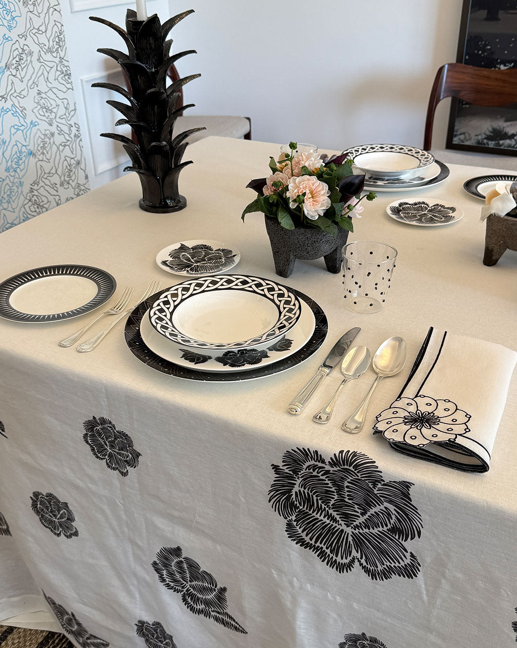 La mantelería IDENTIDAD de Sofía Aspe Interiorismo la esencia de México en cada mesa. El mantel esta confeccionado en lino español con estampado de flores en negro. Sofisticado y clásico.