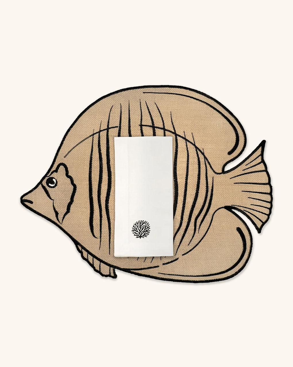 Set completo de mantelería con individuales y servilletas. Los individuales de pez en yute y las servilletas de bordado de coral son el complemento ideal para una mesa chic y veraniega.