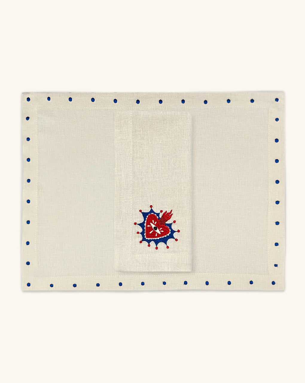 Mantelería Milagritos con Individuales Silvia con Puntitos Azules y Servilletas con Bordado de Corazón con Resplandor Azul en Lino Arena. Set para 4 personas