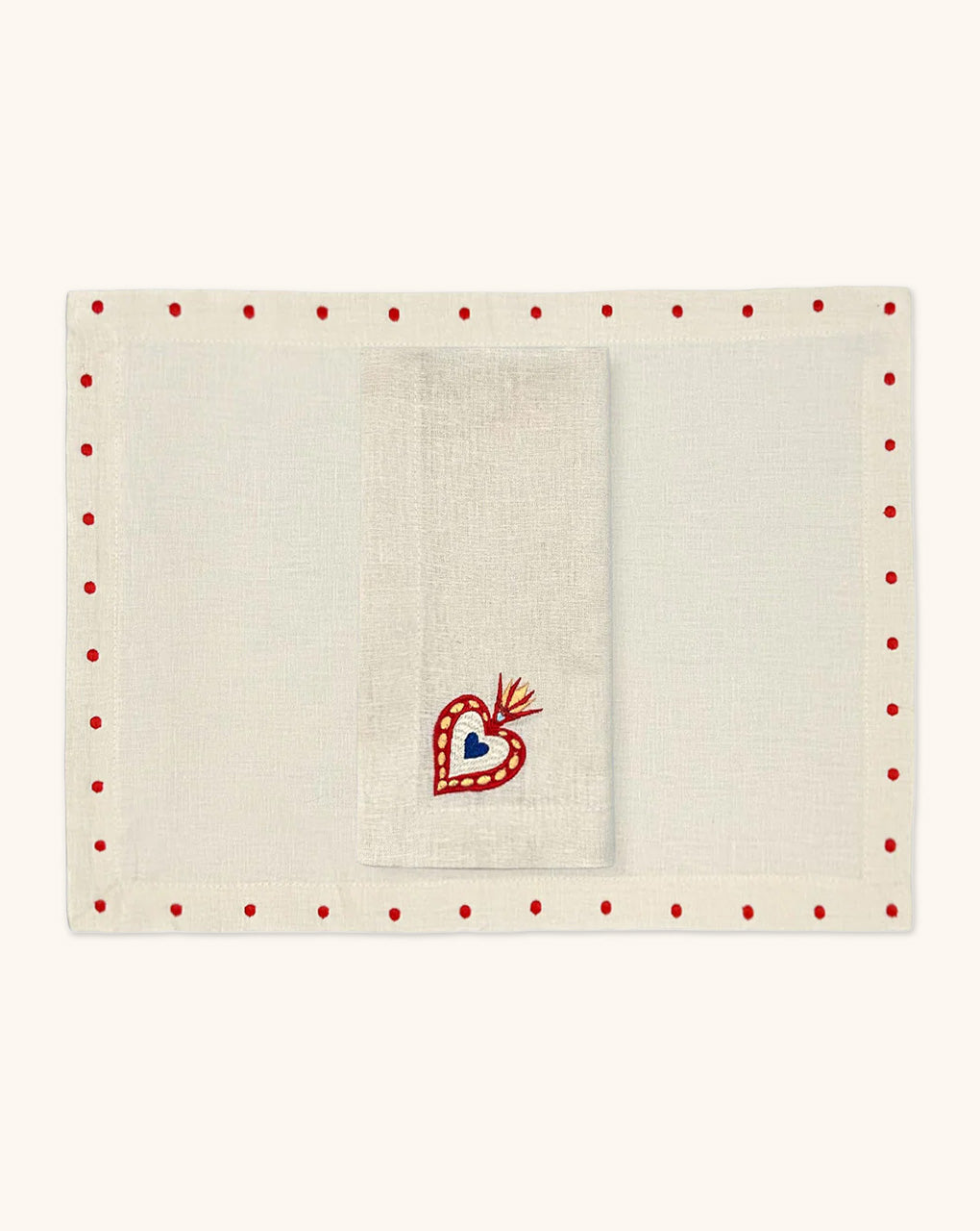Mantelería Milagritos con Individuales Silvia con Puntitos Rojos y Servilletas Milagritos con Bordado de Corazón en llamas en Lino Arena. Set para 4 personas.