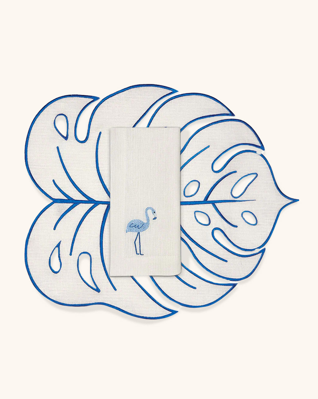 Mantelería Tropic en Lino Arena Bordado con Azul con Individuales de Hoja y Servilleta Bordado de Flamingo. Set para 4 personas