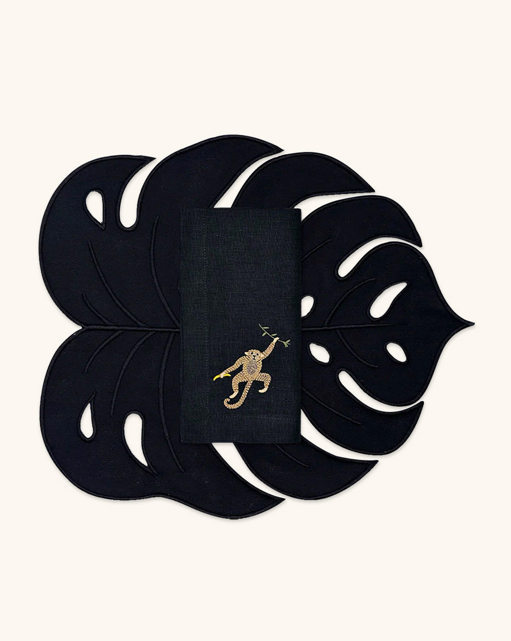 4 Servilletas Tropic en Lino Negro con Bordado de Chango
