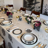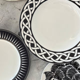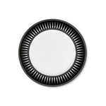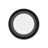 Plato de ensalada de porcelana blanco con borde negro con rayas blancas, de la colección Identidad diseñado por Sofía Aspe Interiorismo para Zash