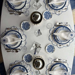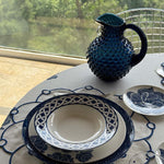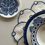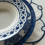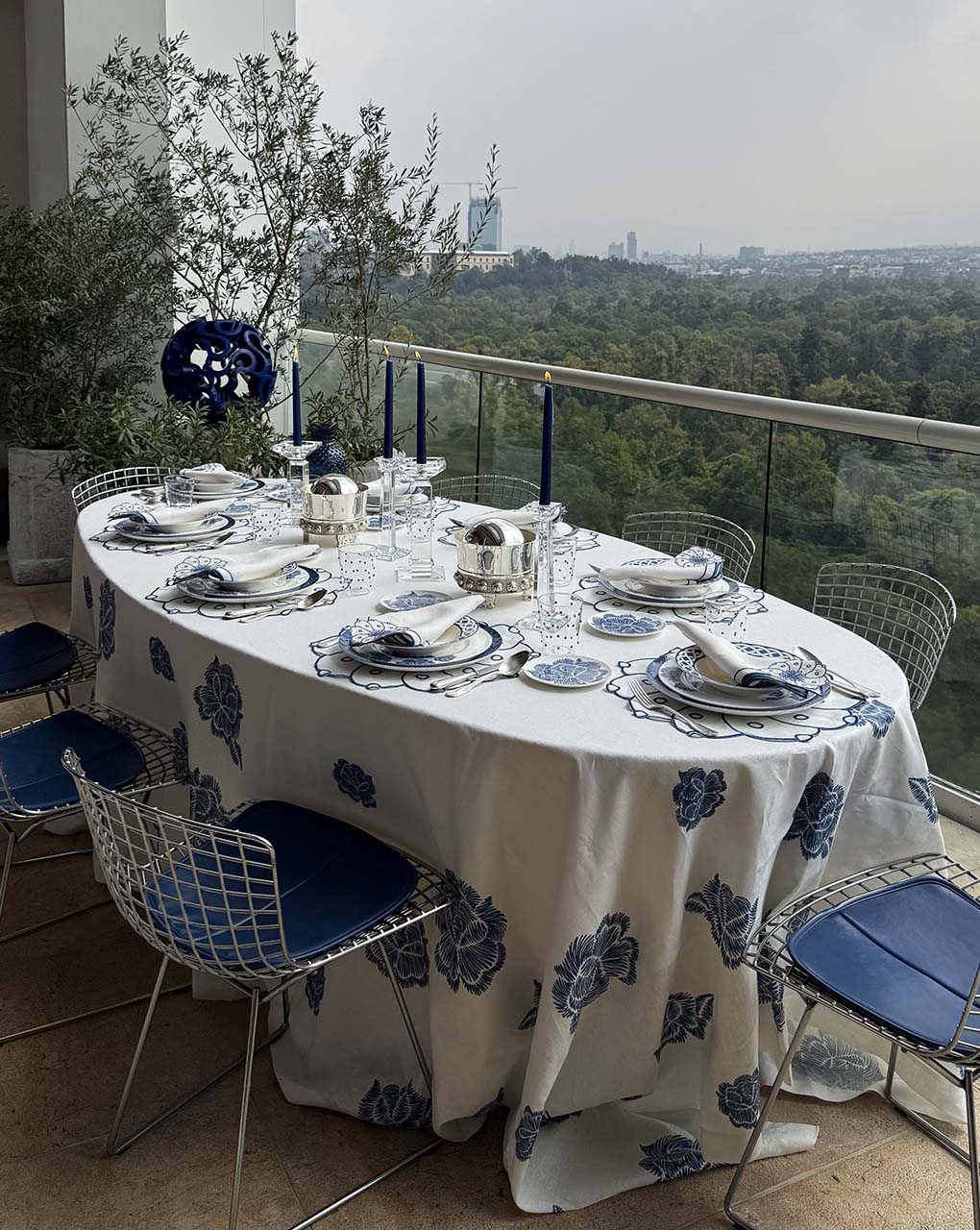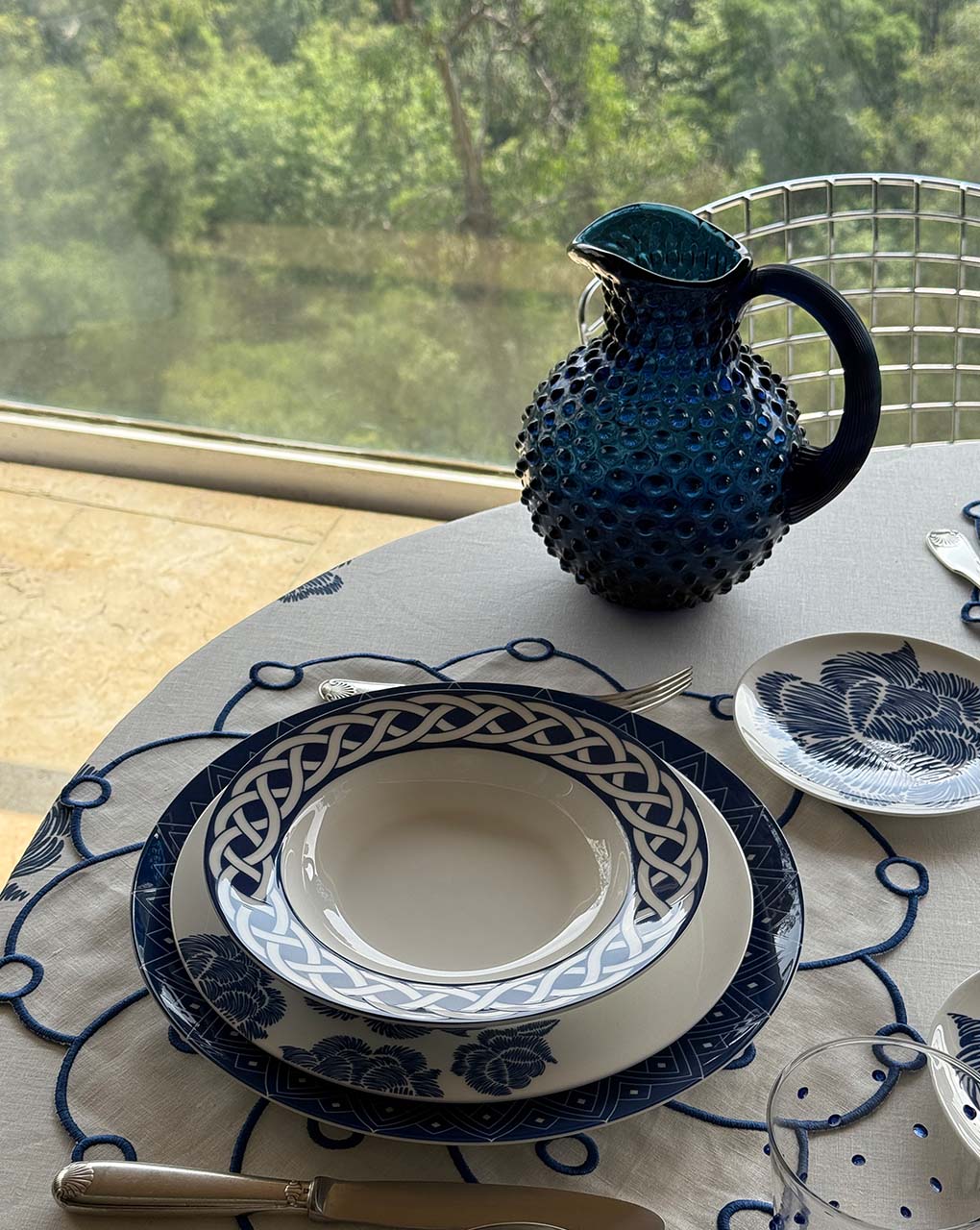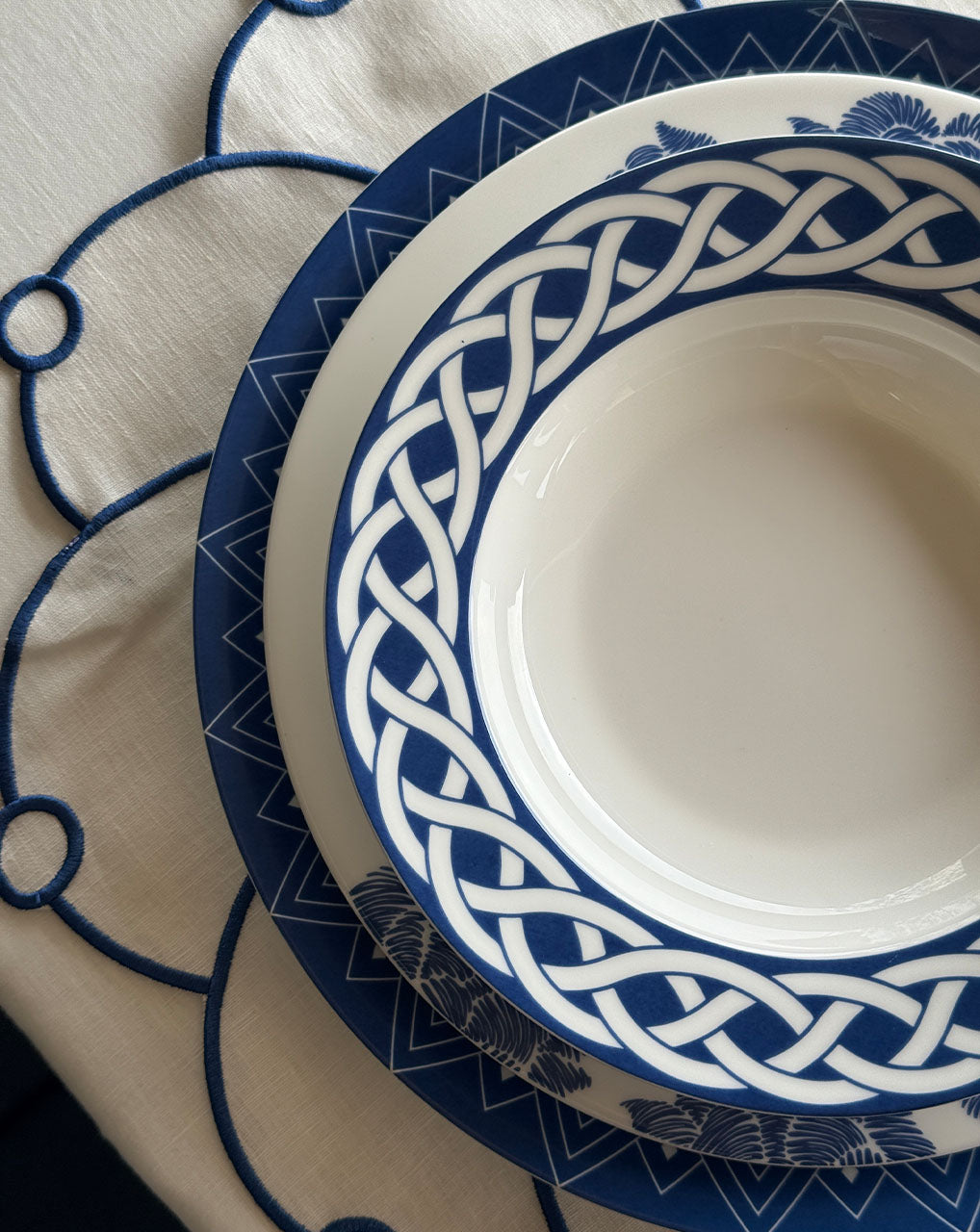 La vajilla IDENTIDAD de Sofía Aspe Interiorismo combina sofisticación con patrones geométricos inspirados en las culturas zapoteca y maya, retomando elementos como grecas, espirales y trenzas que representan la conexión entre lo natural y lo espiritual. Una vajilla elegante y clásica.