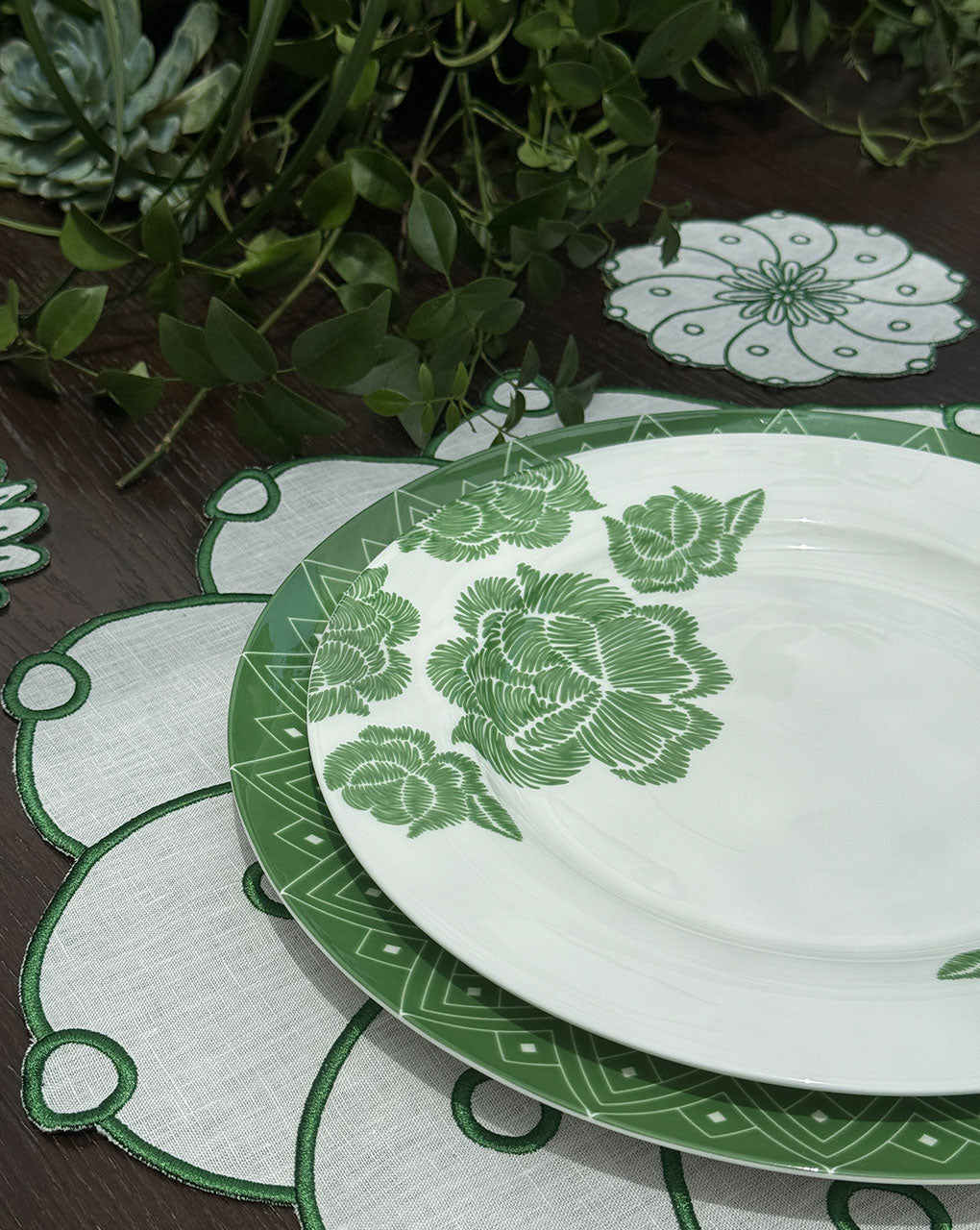 La vajilla IDENTIDAD de Sofía Aspe Interiorismo combina sofisticación con patrones geométricos inspirados en las culturas zapoteca y maya, retomando elementos como grecas, espirales y trenzas que representan la conexión entre lo natural y lo espiritual. Una vajilla elegante y clásica.