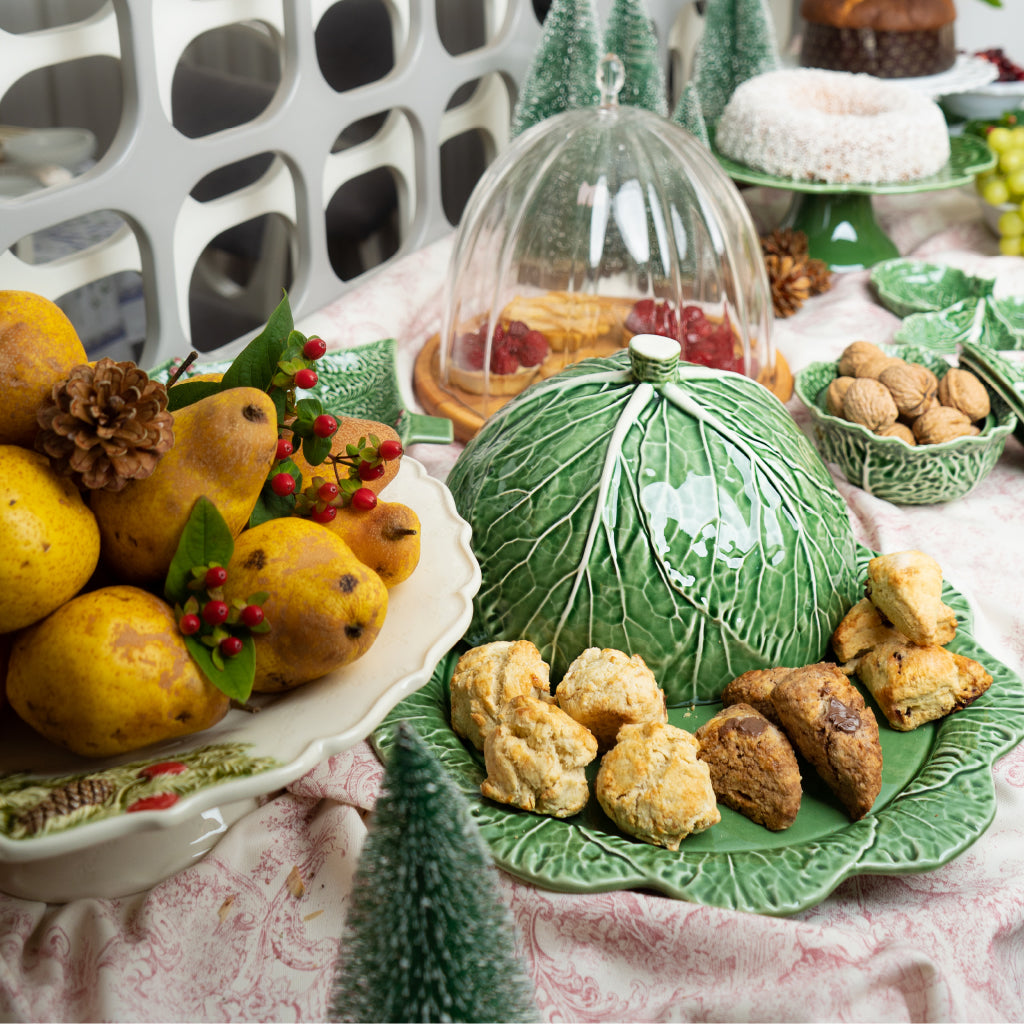 Quesera con tapa de cerámica en forma de hoja de repollo verde, marca Bordallo Pinheiro