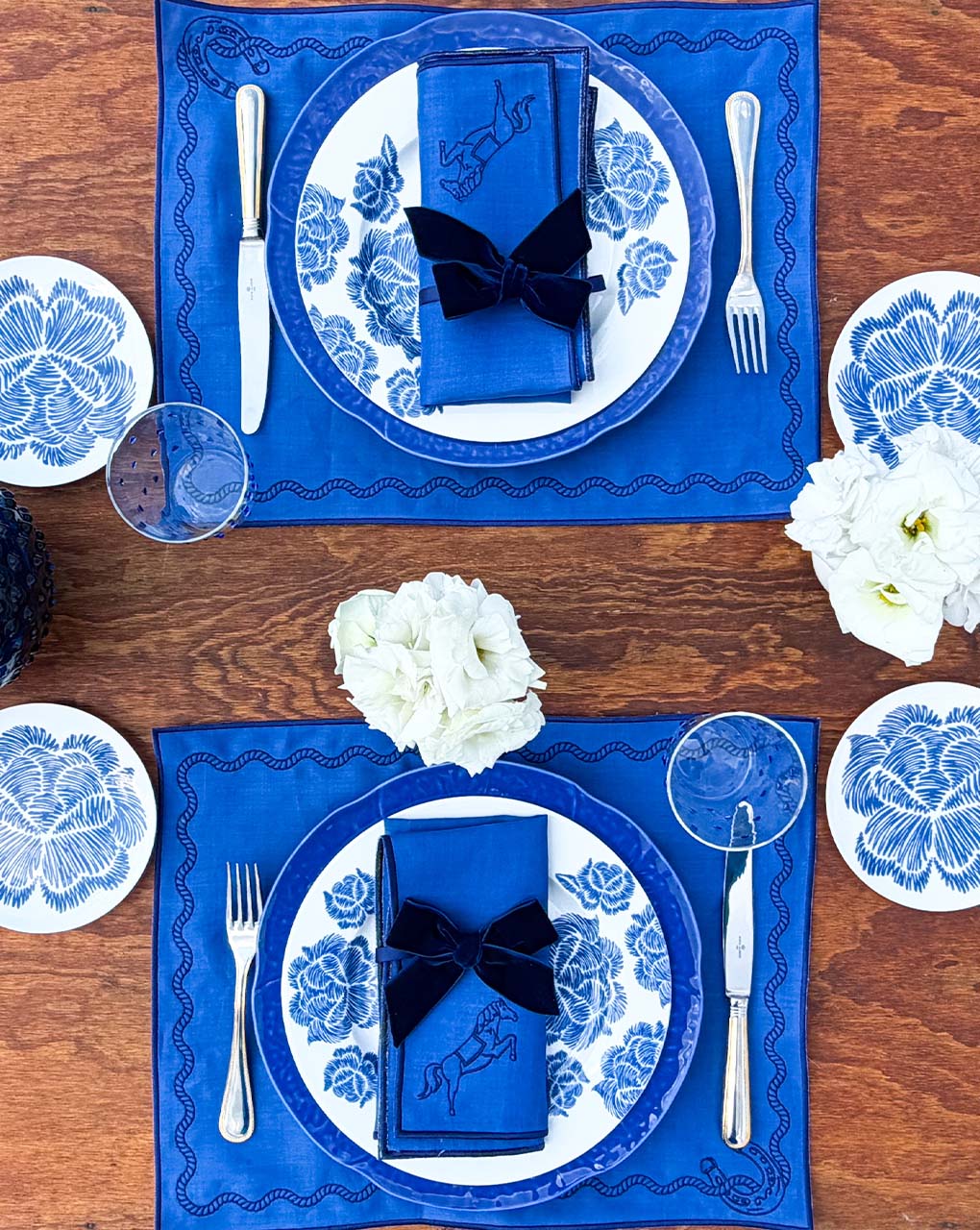 Servilletas en lino azul bordados con un caballo, perfectas para celebrar el año chino del Caballo. Ideales para el rancho y quienes aman montar.