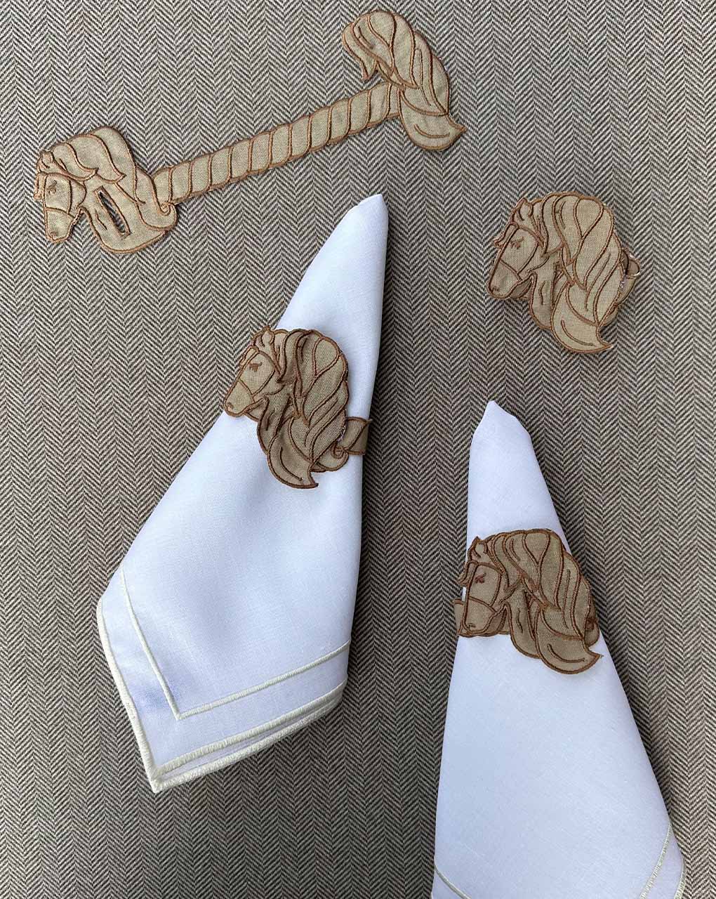 Servilleteros bordados en forma de caballo, cuidadosamente recortados a mano de forma artesanal. El complemento perfecto para una mesa en el rancho.