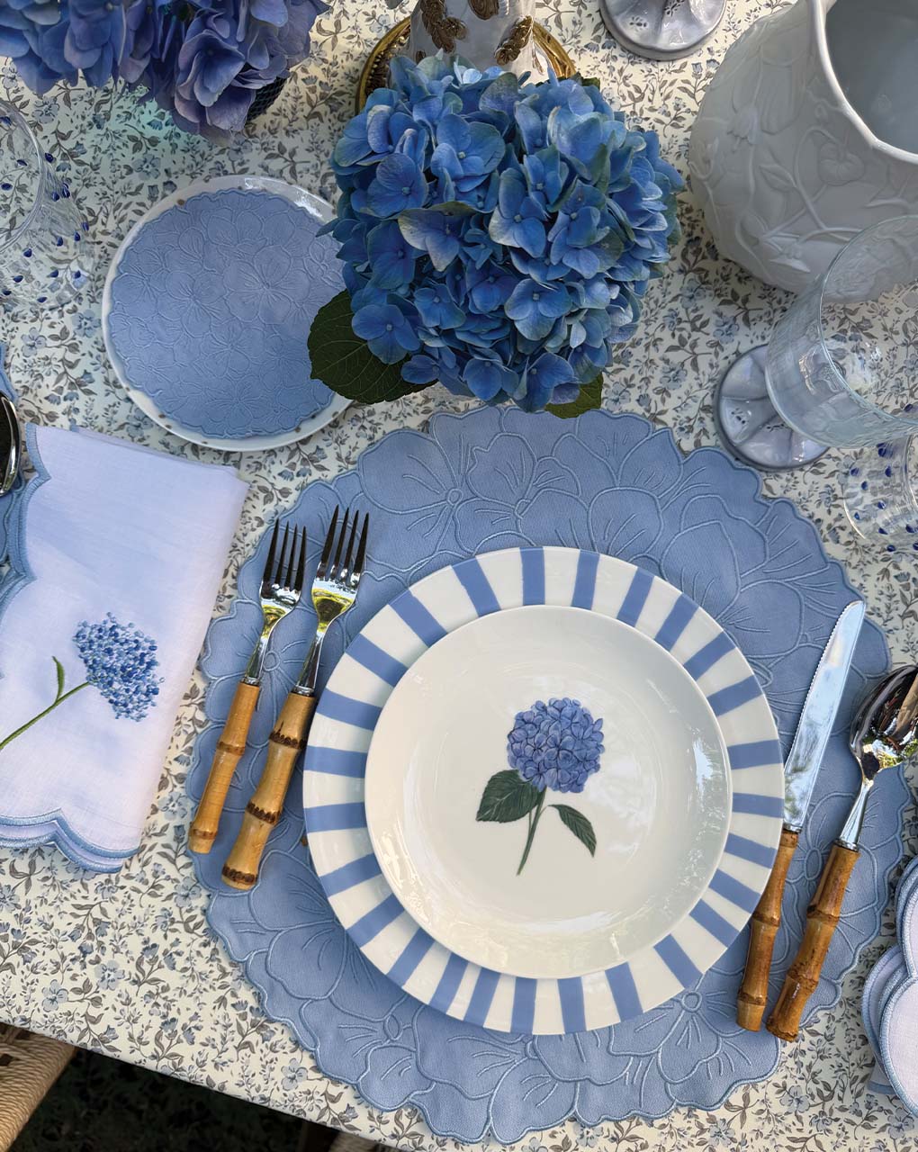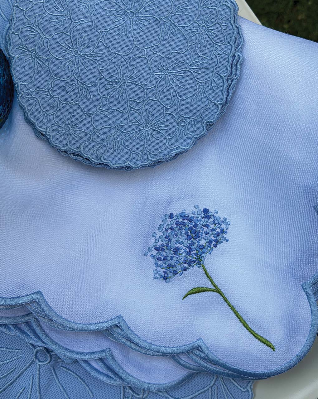Cocteleras alegres y hermosas bordadas en forma de hortensia azul, recortadas cuidadosamente a mano. Ideal para el jardín o terraza.