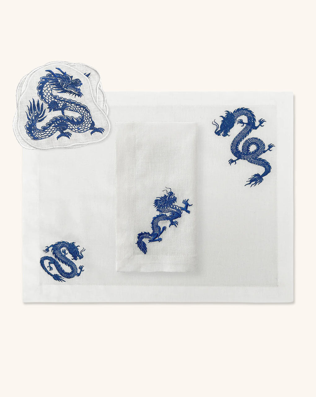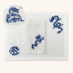 Set 4 Manteles Individuales, 4 Servilletas y 4 Cocteleras en Lino Blanco con Bordado de Dragón Azul