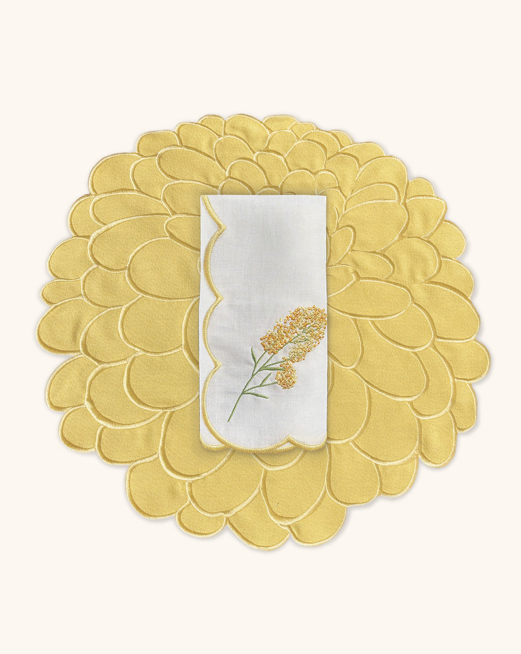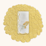 Set de Manteleria Flor Dalia en Loneta Amarilla con Servilleta de Lino Bordado en Amarillo. 8 piezas